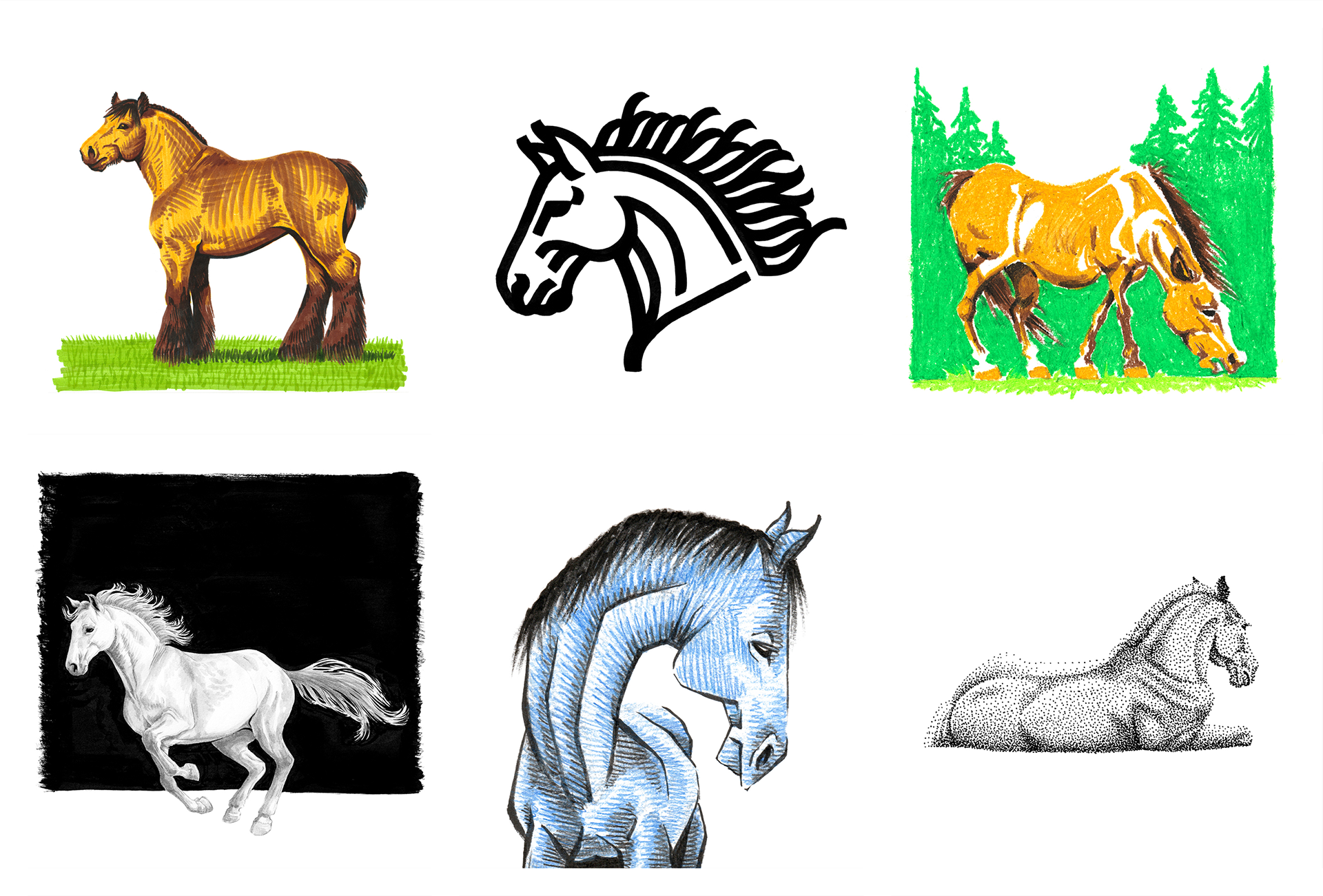 The drawing club I'm a part of had a project where we had to choose a subject and create 50 different illustrations in 50 different variations, with a focus in style & medium exploration. Growing up drawing horses on the back of all my homework, the choice was a no-brainer.
